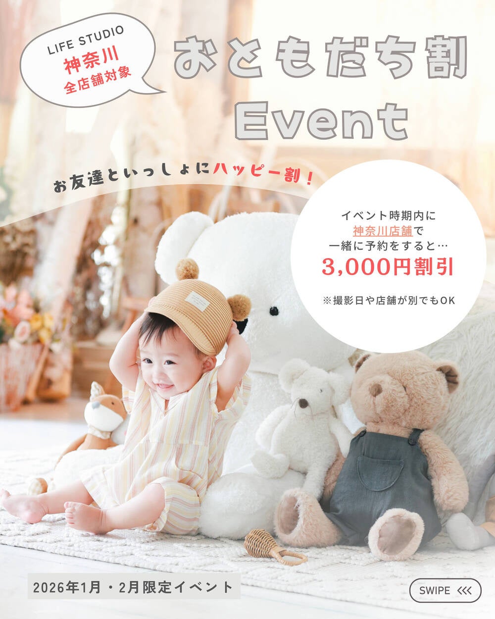 ライフスタジオ 神奈川エリア(新百合ヶ丘・新横浜・横浜青葉・湘南)では、2026年1月1日~2月28日の期間限定で、お友だちと一緒に撮影予約/撮影されたお客様ご本人もお友達もそれぞれ3,000円OFF のおトクな「おともだち割イベント」を実施します。家族や兄弟だけでなく、親しい友人との思い出づくりにもぴったりの機会です。