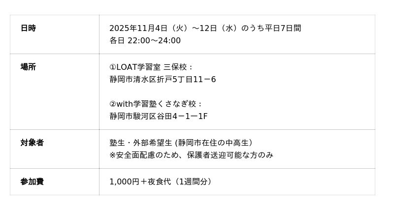 静岡市の塾LOAT学習室、テスト前の中高生を対象に24時まで塾を開放する新企画「ミッドナイト・スタディ・クラブ」を実施。