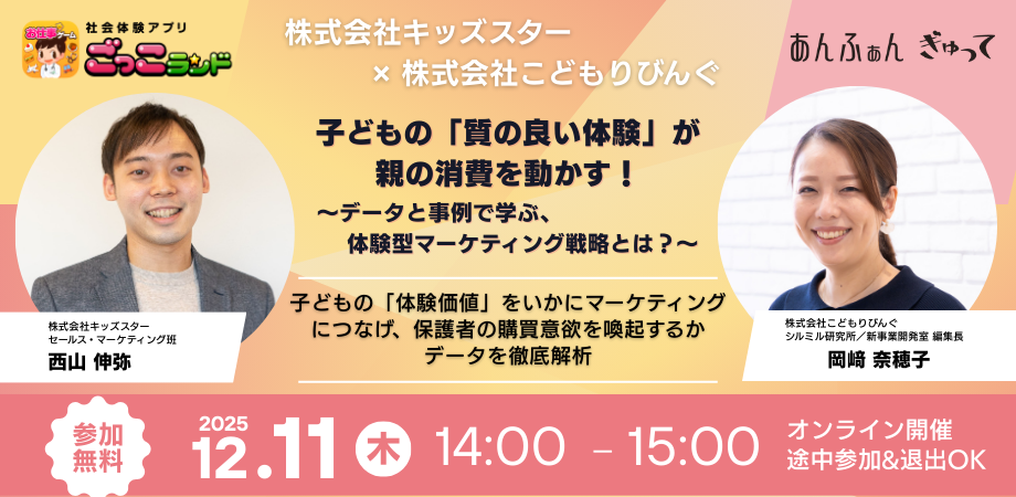 【無料ウェビナー】子どもの体験と購買メカニズムを徹底分析「質の良い体験」が親の消費を動かす!~データと事例で学ぶ、体験型マーケティング戦略とは?~12/11(木)開催