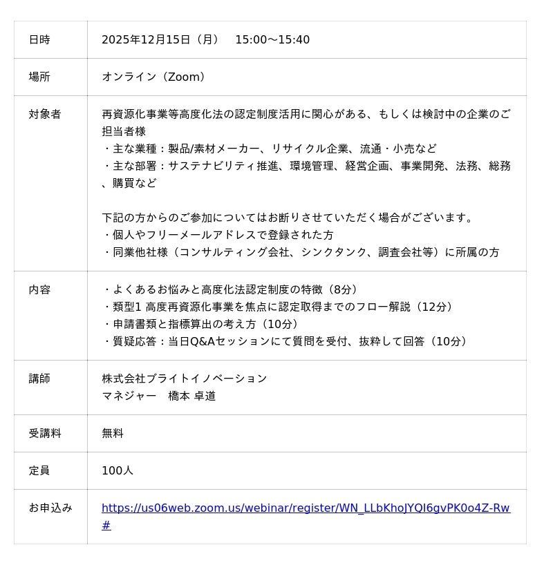 エンビプロ・ホールディングスエンビプログループの株式会社ブライトイノベーション(本社:東京都中央区、代表取締役社長:荻巣 和紀、以下「当社」)は、再資源化事業等高度化法の認定制度活用に関心がある、もしくは検討中の企業のご担当者様向けに、再資源化事業等高度化法の認定制度活用の最新手引きのポイントについて無料ウェビナーを開催します。