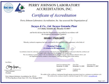鈴与(株)新メディカルサービス事業準備室 鈴与御殿場プラントにて試験所認定(ISO/IEC 17025:2017)を取得