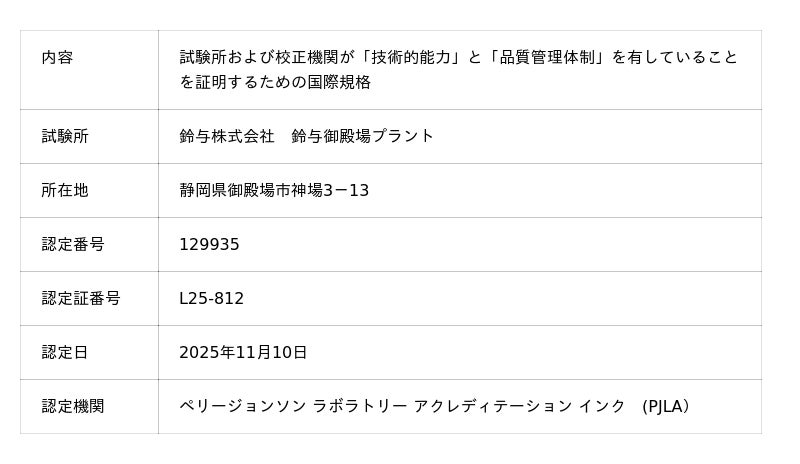鈴与株式会社(本社:静岡市、代表取締役社長:鈴木 健一郎、以下:当社)は、2025年11月10日、新メディカルサービス事業準備室の鈴与御殿場プラントにて、医療機器の洗浄評価となるタンパク質定量分析の試験について、国際規格ISO/IEC 17025:2017(試験所や校正機関の技術力を証明する国際規格)の認定を取得しました。これにより当社は、国際基準に準拠した信頼性の高いタンパク質の定量分析サービスを提供できる体制となりました。
