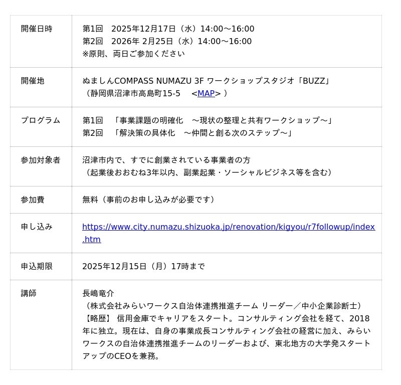 株式会社みらいワークス~沼津市内の創業者限定、全2回のリアルセミナーを開催~