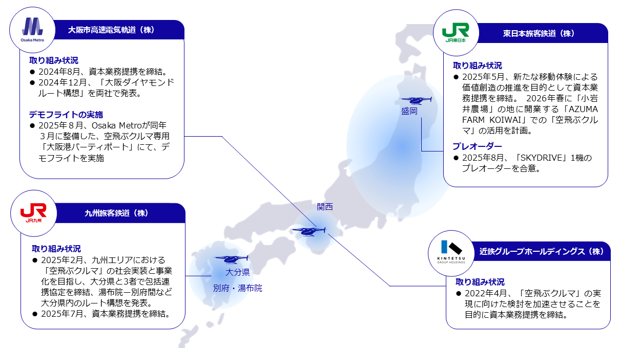 SkyDriveの空飛ぶクルマと既存の鉄道ネットワークを連携させ、陸と空をシームレスに繋ぐ新しい移動手段の提供を目指しています。