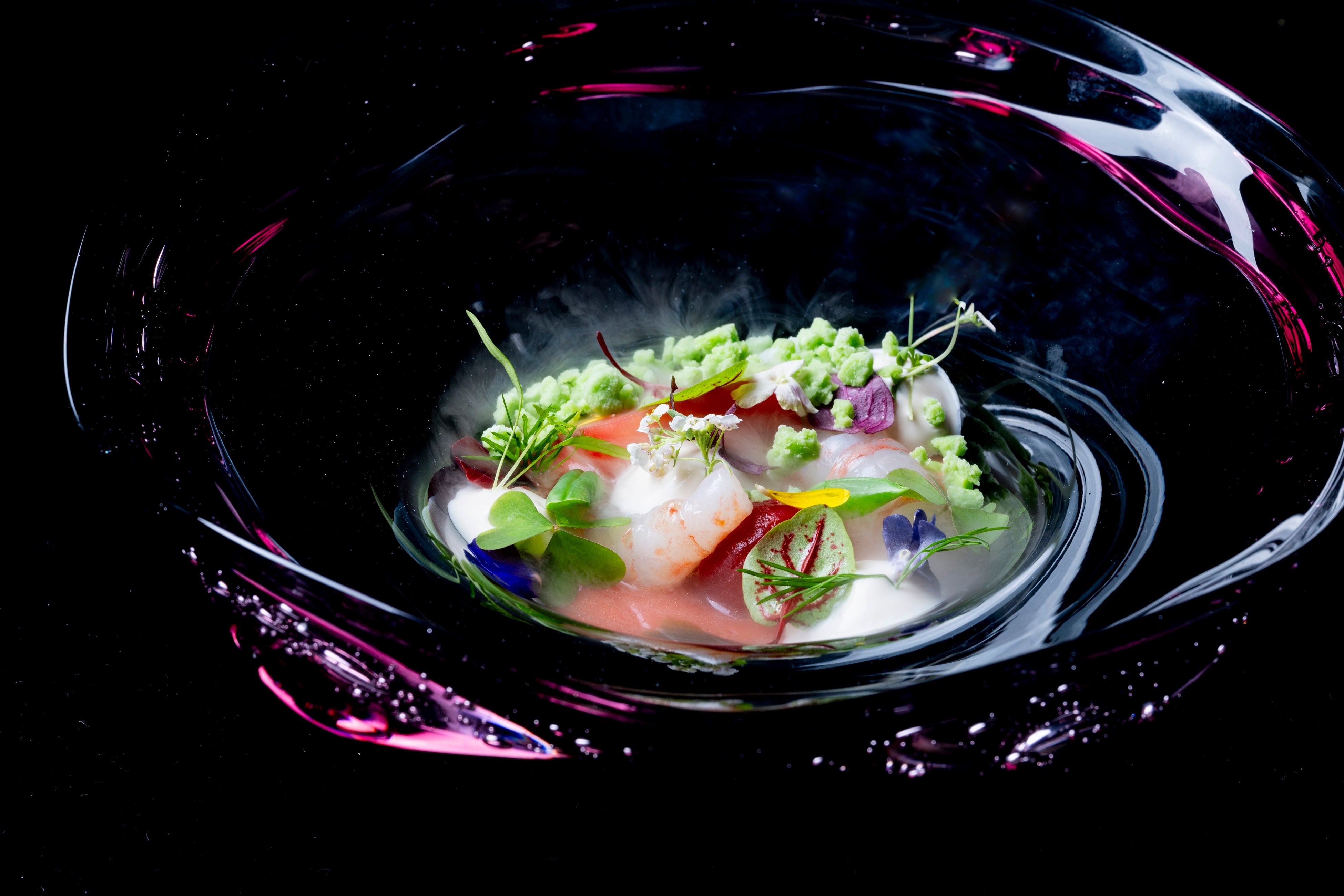 甘みが凝縮したアメーラトマト、ボタン海老を主役に、数種の野菜、エディブルフラワー、そしてアーモンドのエスプーマを添えたサラダ。