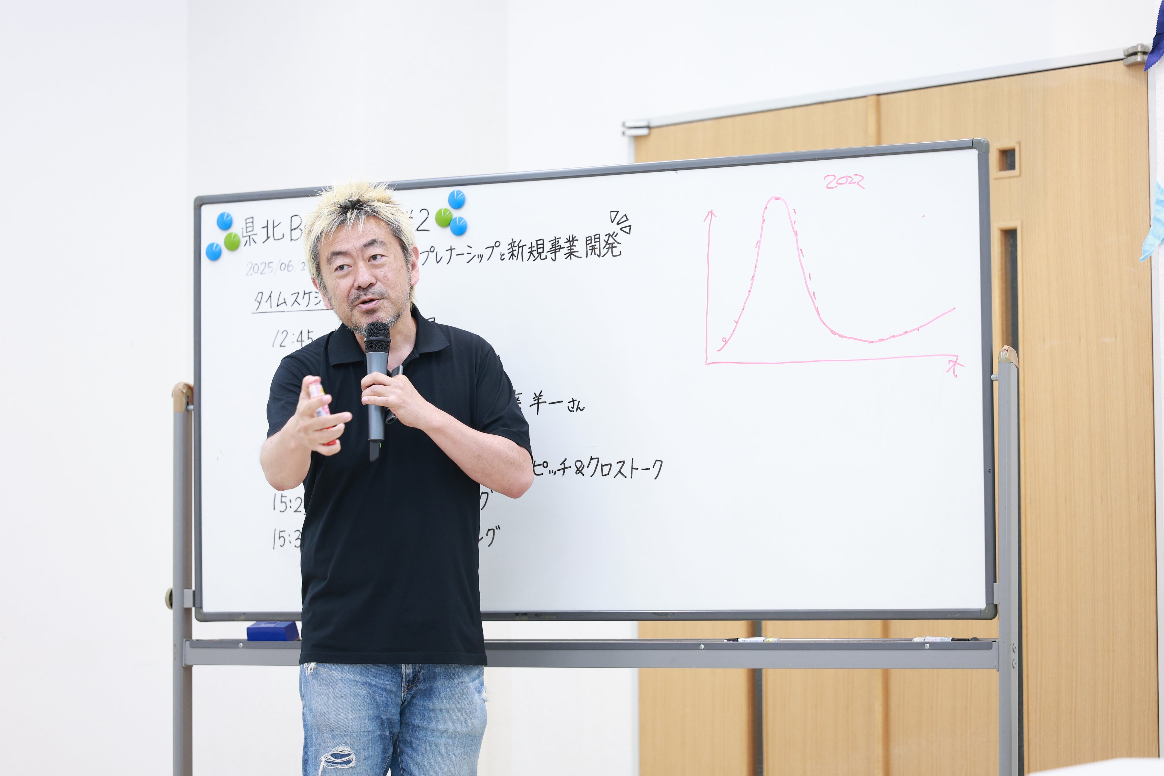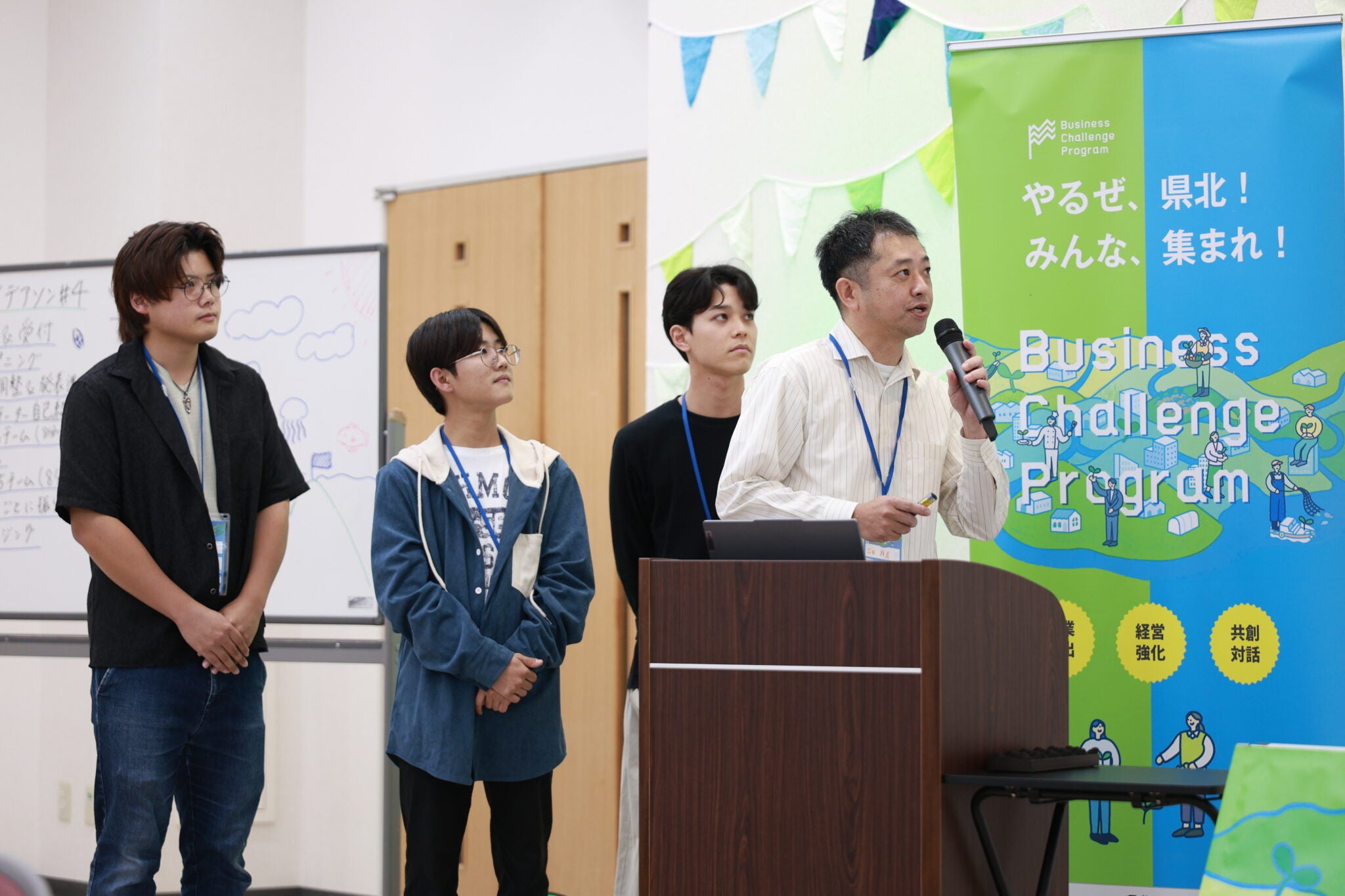 また後半には、県北BCPリーダーOBOGによるトークセッションを開催。県北BCPリーダーOBOGである、福地 美喜さん(株式会社八千代商事 / 2022年度)、佐々木 謙彦さん(株式会社佐々木製作所 / 2023年度)、茅根 太造さん(有限会社茅根電設工業 / 2024年度)より、アイデアソンに参加していた時のことを振り返りながら、その経験がどのように今につながっているのかをたっぷりお話しいただきました。