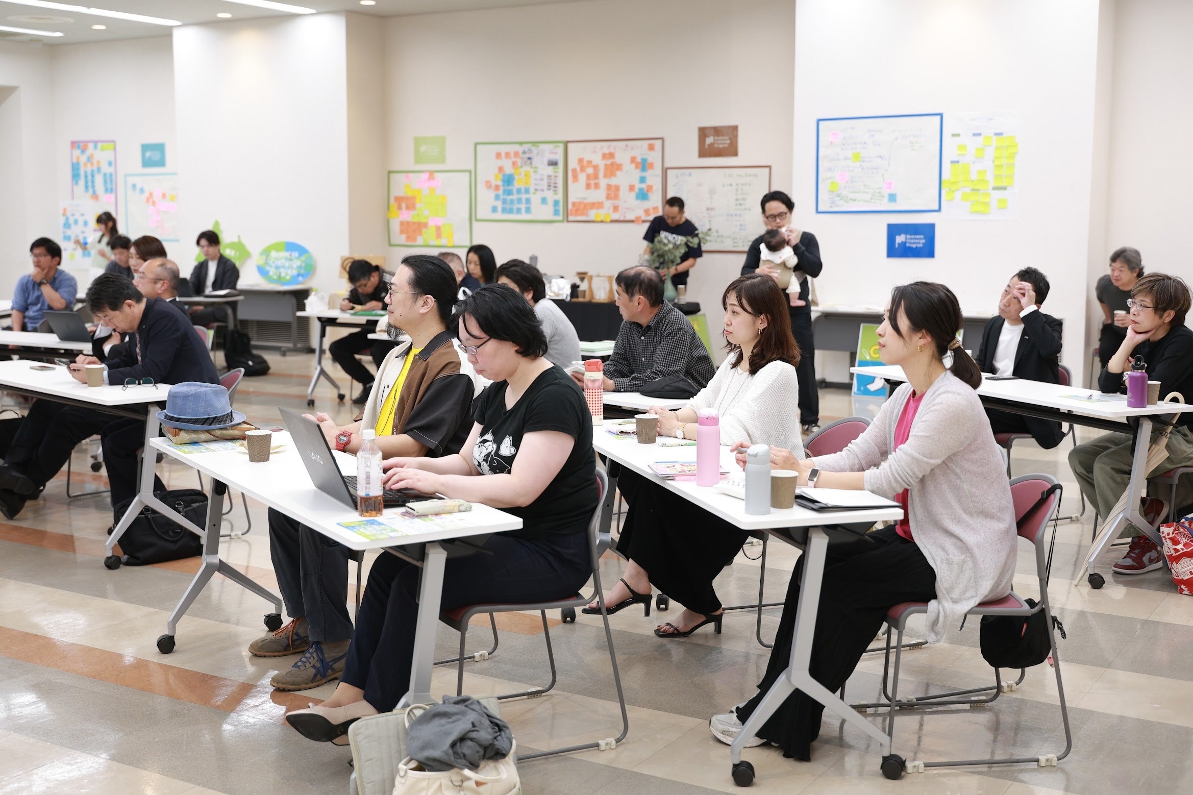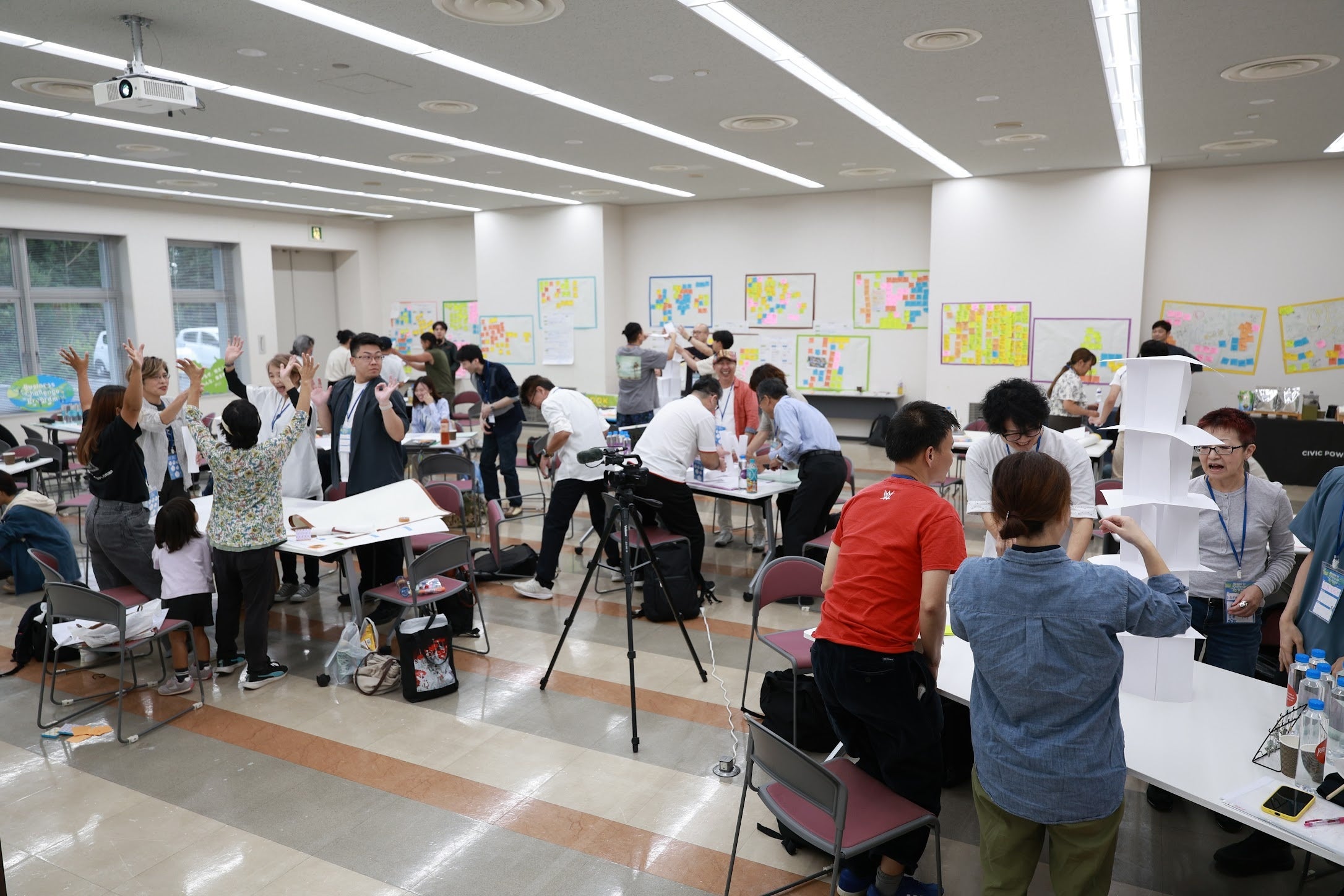 会場である日立地区産業支援センター(HITS)に過去4年間の#1史上最多となる91名の方々が大集結。茨城県内外はもちろん海外からの参加者でにぎわい、2025年シーズンのスタートを盛大に迎えることができました。会場には、昨年のリーダーやリピーター、今回が初めてのチャレンジャー、さまざまな人たちが集まってリーダーのテーマを一緒に深掘り。まちのこ団によるあそび場で汗だくになって遊ぶ子どもたちも!日本語・英語・フランス語が飛び交う会場は活気で溢れていました。