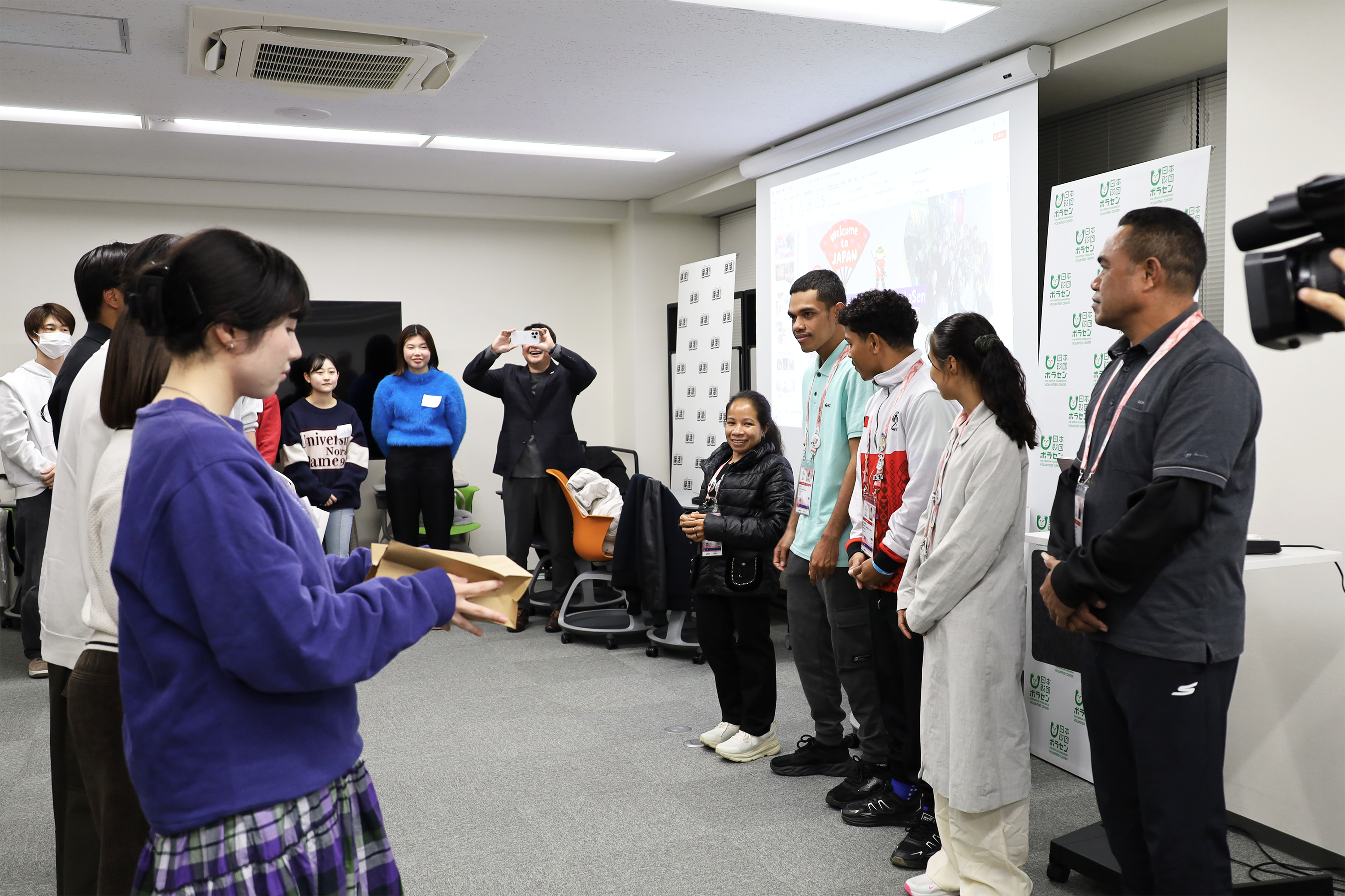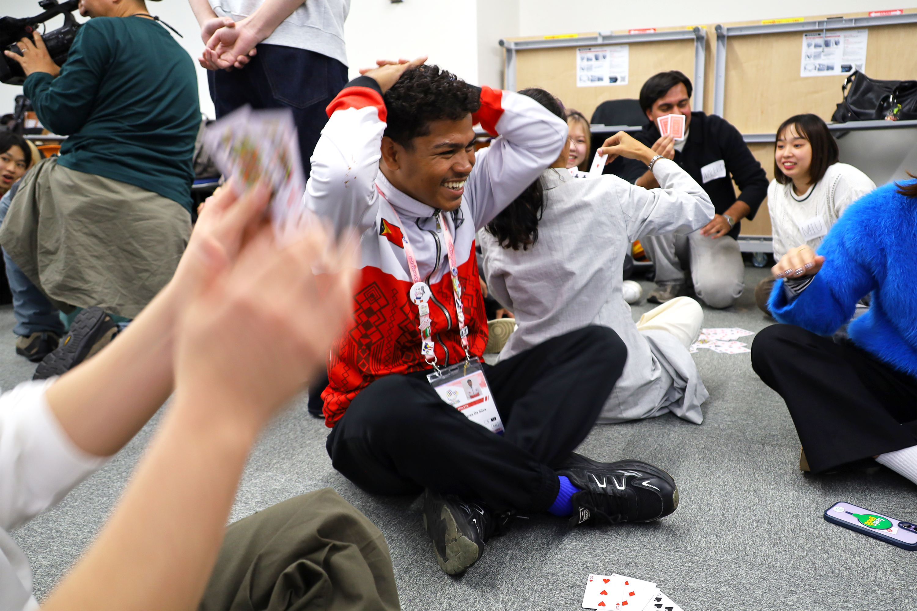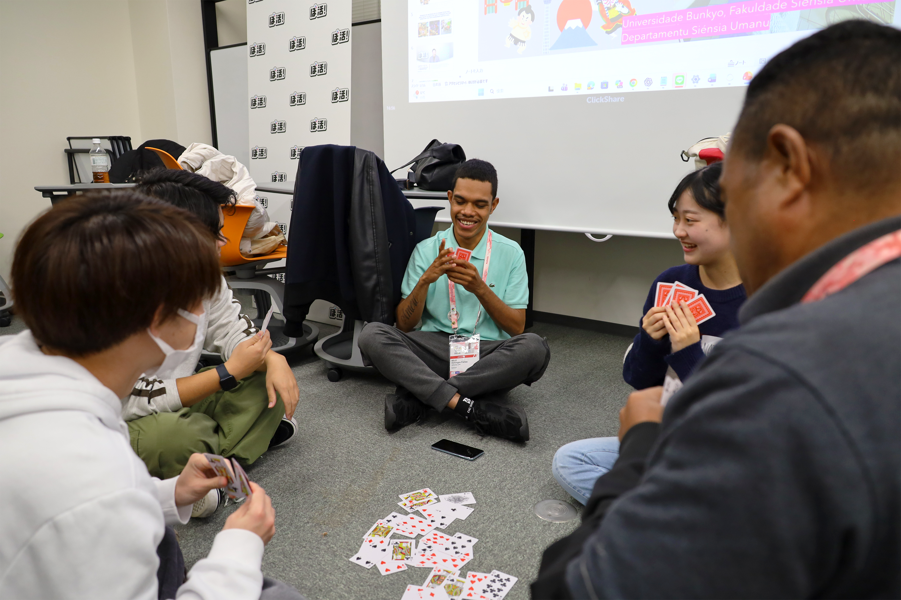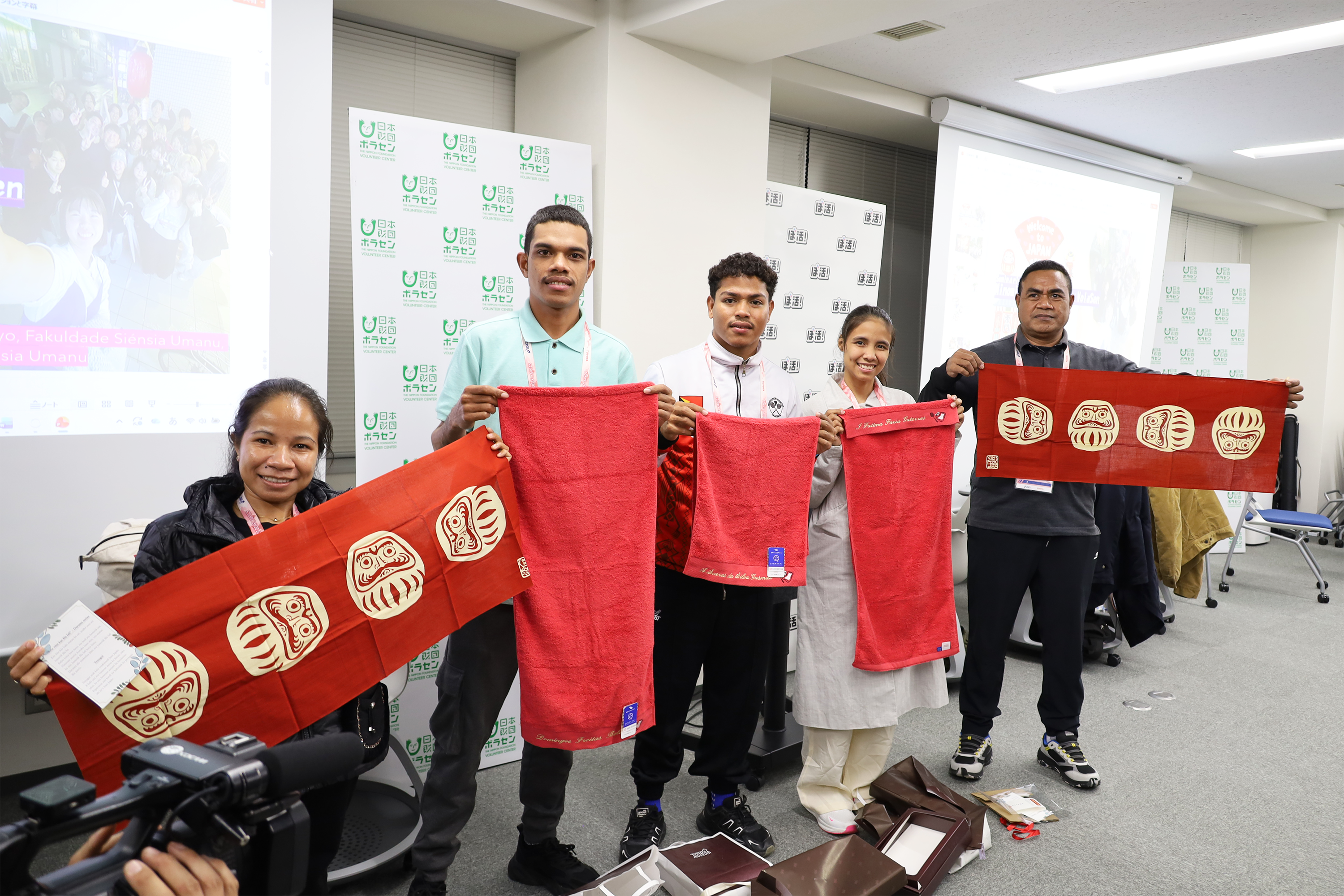 活動内容紹介の後は、トランプゲームの「ババ抜き」を実施して交流を深め、最後には、学生達から選手達に、東ティモールの国旗と同色である赤色のタオルと手ぬぐいが記念品として贈られました。