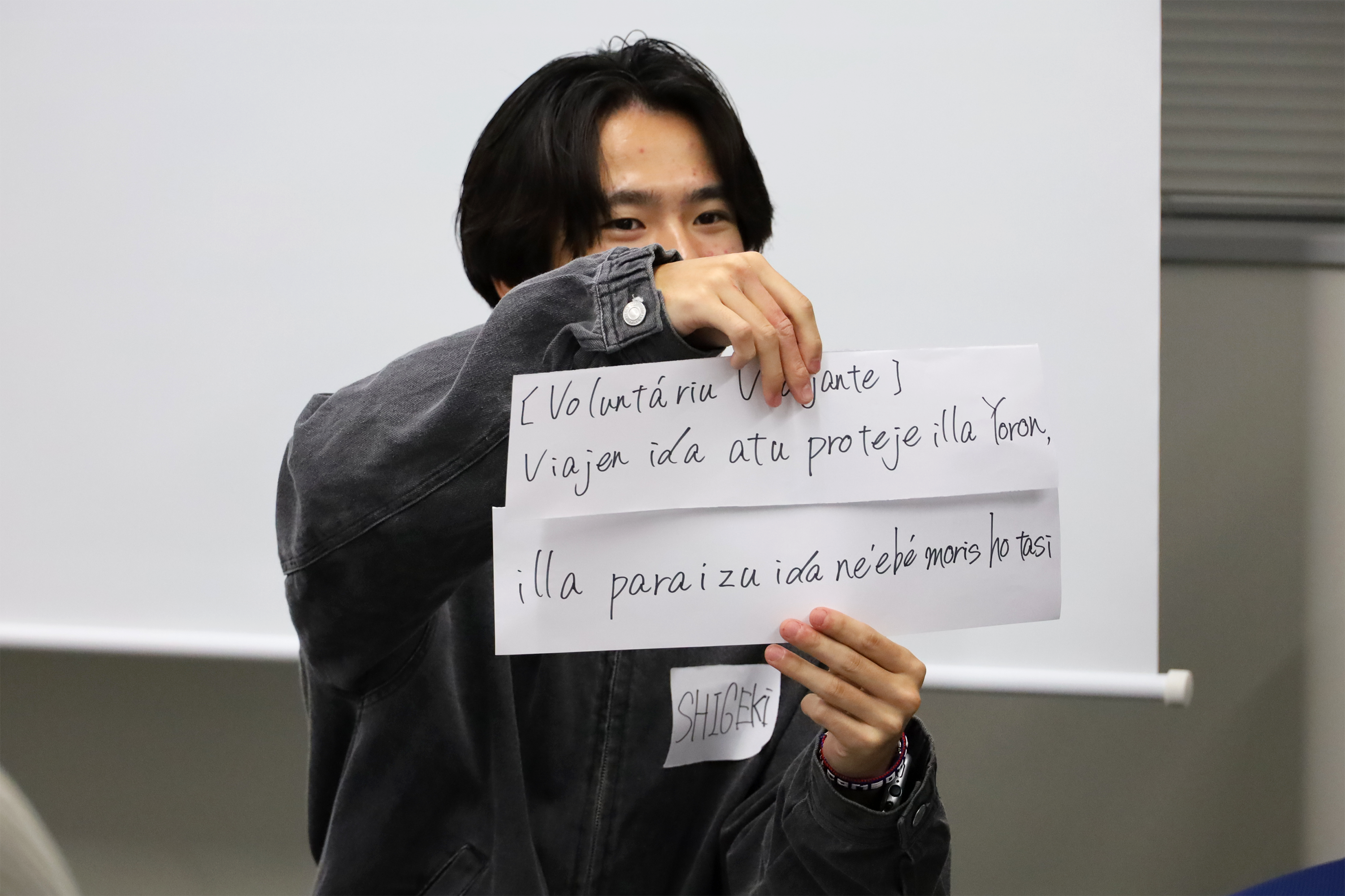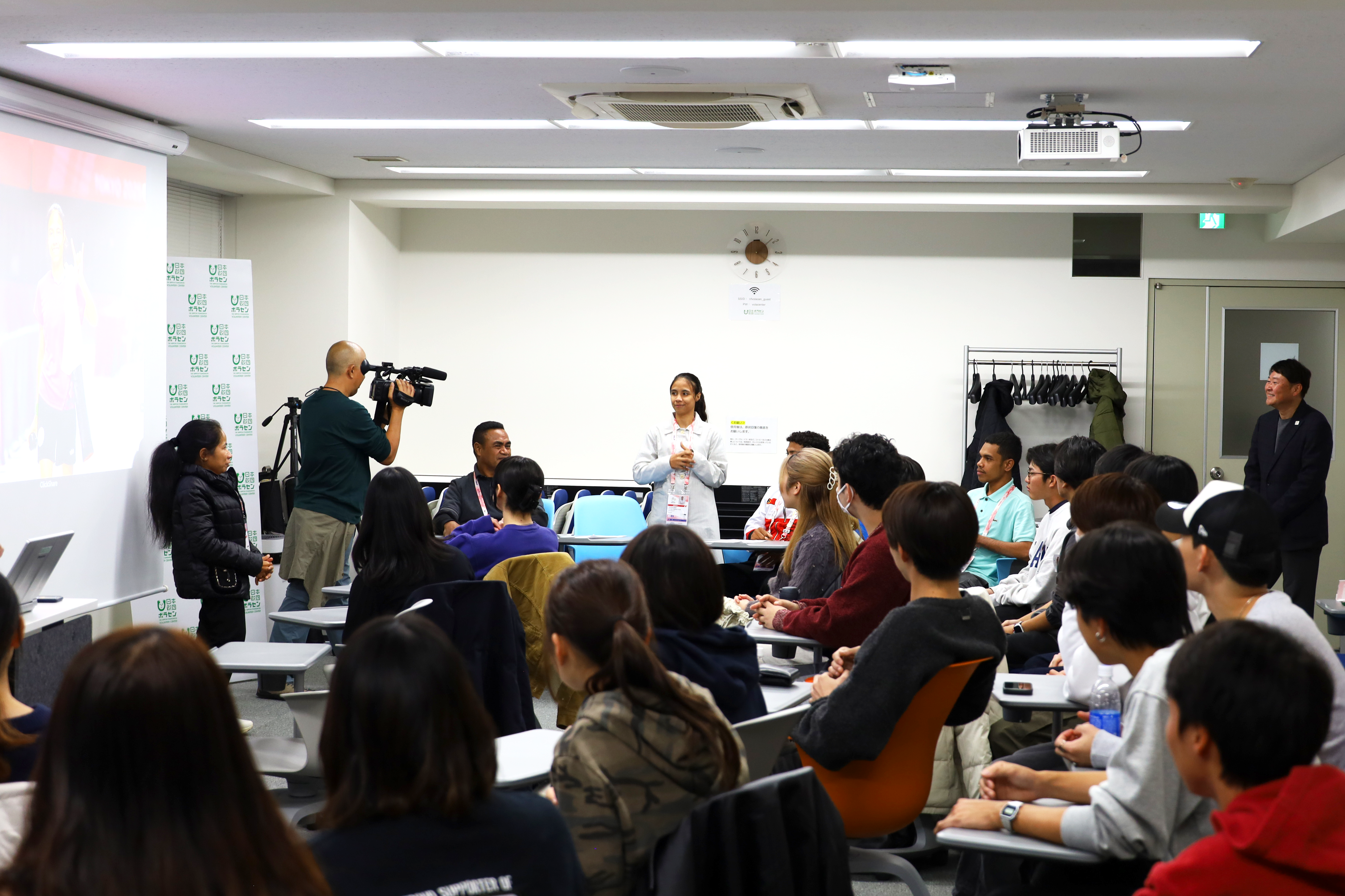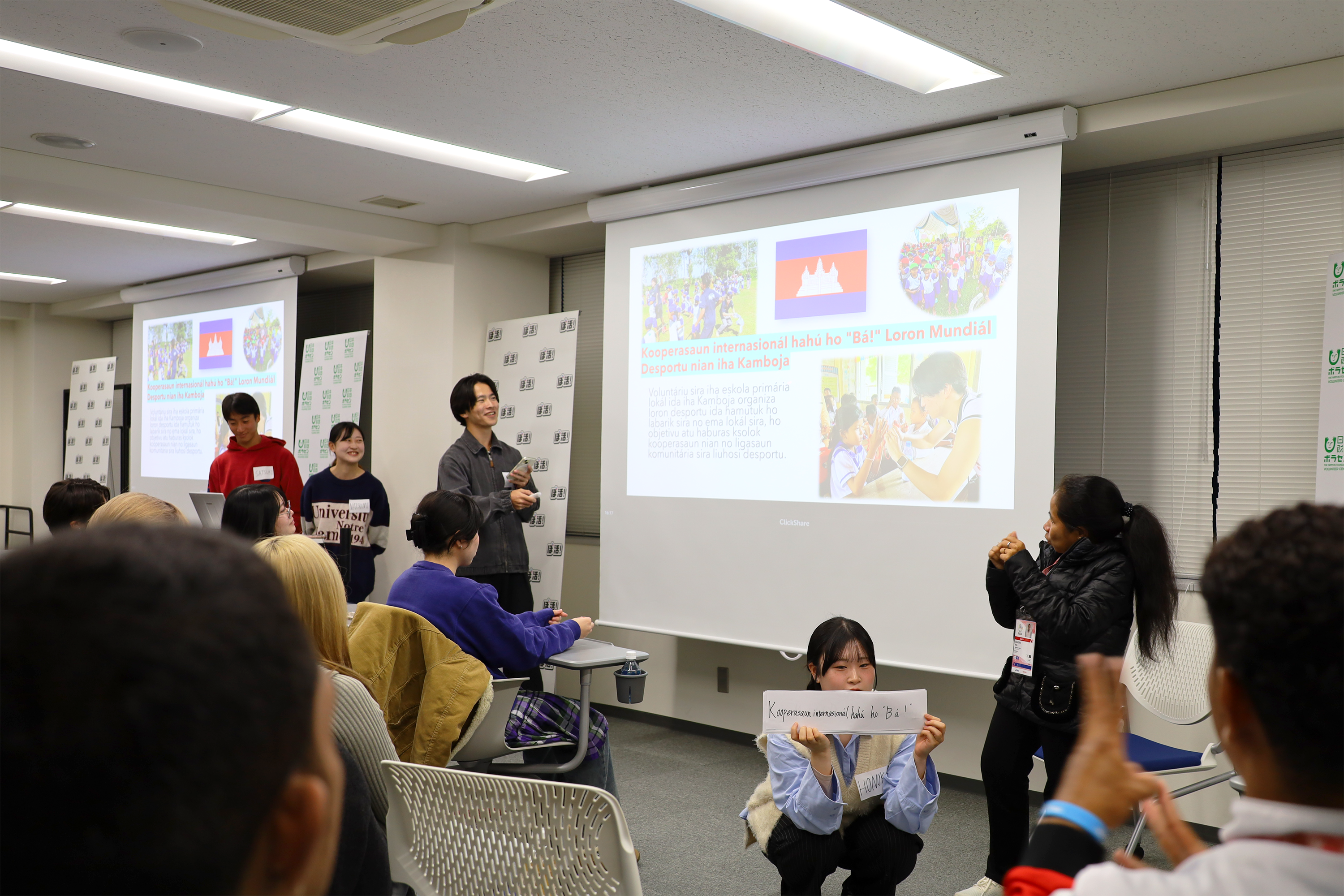 二宮雅也教授のゼミナールでは、スポーツと社会課題解決をテーマとして活動しており、各種スポーツイベントや地域イベントでのボランティアを実施しています。同教授が日本財団ボラセンの参与を務めていることから今回の交流会が実現しました。プログラムのはじめに、同ゼミナールの学生達から選手達に向けてゼミナール活動内容の紹介がありました。選手達からは活動内容への質問や感想が寄せられ、東ティモールの大学生のボランティア活動との比較や、海外での活動、ろう者を対象とした活動についての意見交換がされました。