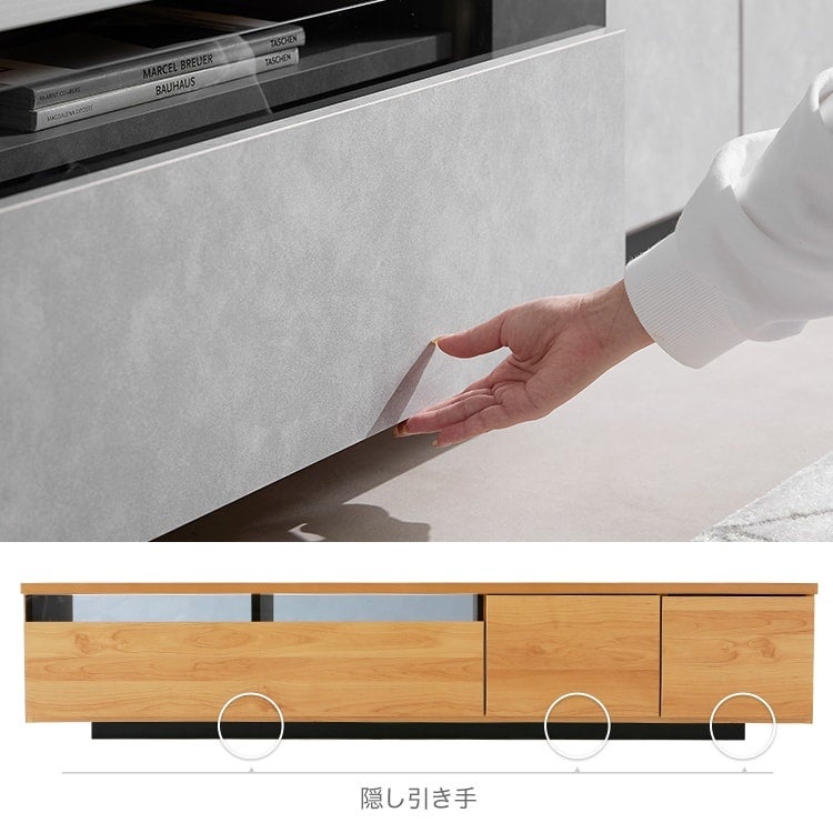 取っ手を見せない隠し引き手や、フラットに揃えた前板デザインなど、シンプルな中にも細部まで行き届いたつくりが魅力。リビングになじみながらも、程よく存在感を放ってくれます。