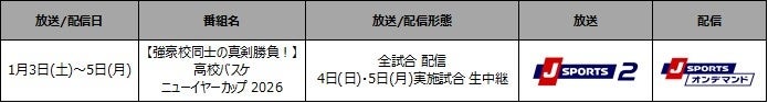 ※放送/配信内容は変更になる場合があります。詳しくはJ SPORTS総合サイト内「高校バスケ ニューイヤーカップ」をご確認ください。