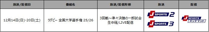 ※放送/配信内容は変更になる場合があります。詳しくはJ SPORTS総合サイト内「大学ラグビー」をご確認ください。