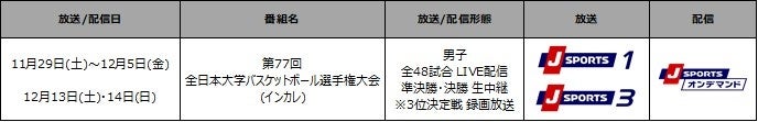 ※放送/配信内容は変更になる場合があります。詳しくはJ SPORTS総合サイト内「大学バスケ インカレ」をご確認ください。