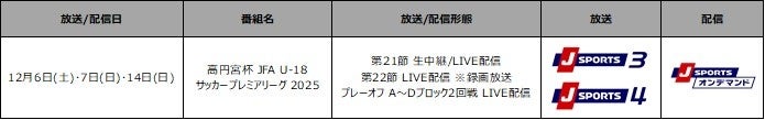 ※放送/配信内容は変更になる場合があります。詳しくはJ SPORTS総合サイト内「高円宮杯 JFA サッカープレミアリーグ」をご確認ください。