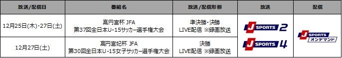 J SPORTSでは、「高円宮杯JFA 第37回全日本U-15サッカー選手権大会」準決勝・決勝、「高円宮妃杯JFA 第30回全日本U-15女子サッカー選手権大会」決勝を放送/J SPORTSオンデマンドLIVE配信で