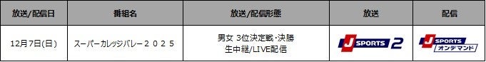 ※放送/配信内容は変更になる場合があります。詳しくはJ SPORTS総合サイト内「大学バレー」をご確認ください。