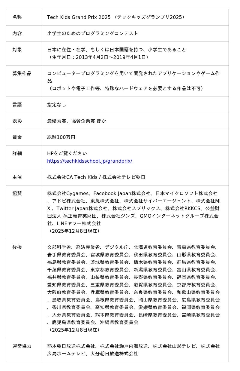 株式会社CA Tech Kids(読み:シーエーテックキッズ、本社:東京都渋谷区、代表取締役社長:上野朝大)と、株式会社テレビ朝日(本社:東京都港区、代表取締役社長:西 新、以下テレビ朝日)は、共同で開催する全国No.1小学生プログラマーを決定するプログラミングコンテスト「Tech Kids Grand Prix 2025」の応募総数が11,554件となったことをお知らせいたします。