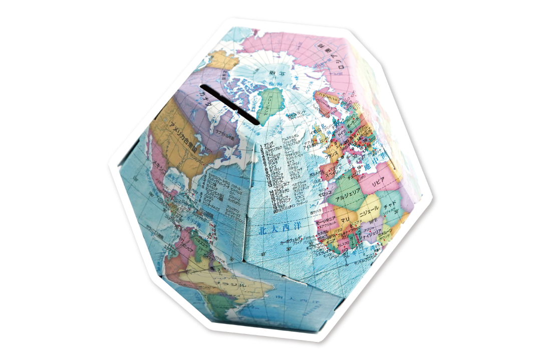 のりやはさみなど、道具を使わずに組み立てられる、正十二面体の地球儀。一つひとつの国名・首都名が記載されているので、見るだけで世界の国々にどんどんくわしくなれます! 貯金箱としてもご利用いただけます。