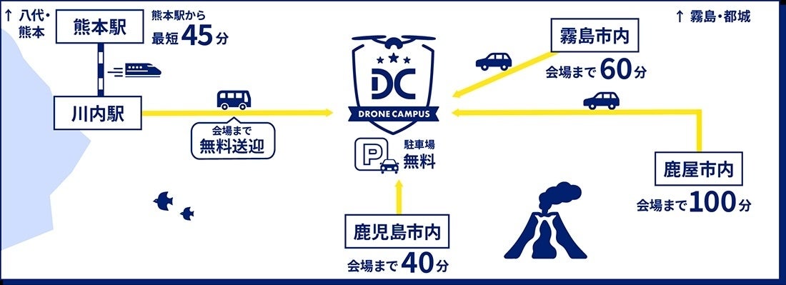 「ドローンキャンパス 鹿児島の空」は、薩摩川内市にある「入来総合運動場体育館」を講習会場として活用します。広々とした屋内施設を利用することで、天候に左右されず、集中して実技講習に取り組むことが可能です。本スクールは、鹿児島市内から車で約40分という立地に加え、熊本駅からも最寄りの川内駅まで新幹線等を利用して約45分と、県内外からのアクセスが良好です。川内駅からは無料送迎も実施するため、遠方からの受講者も安心して「1泊2日」の合宿に参加いただけます。