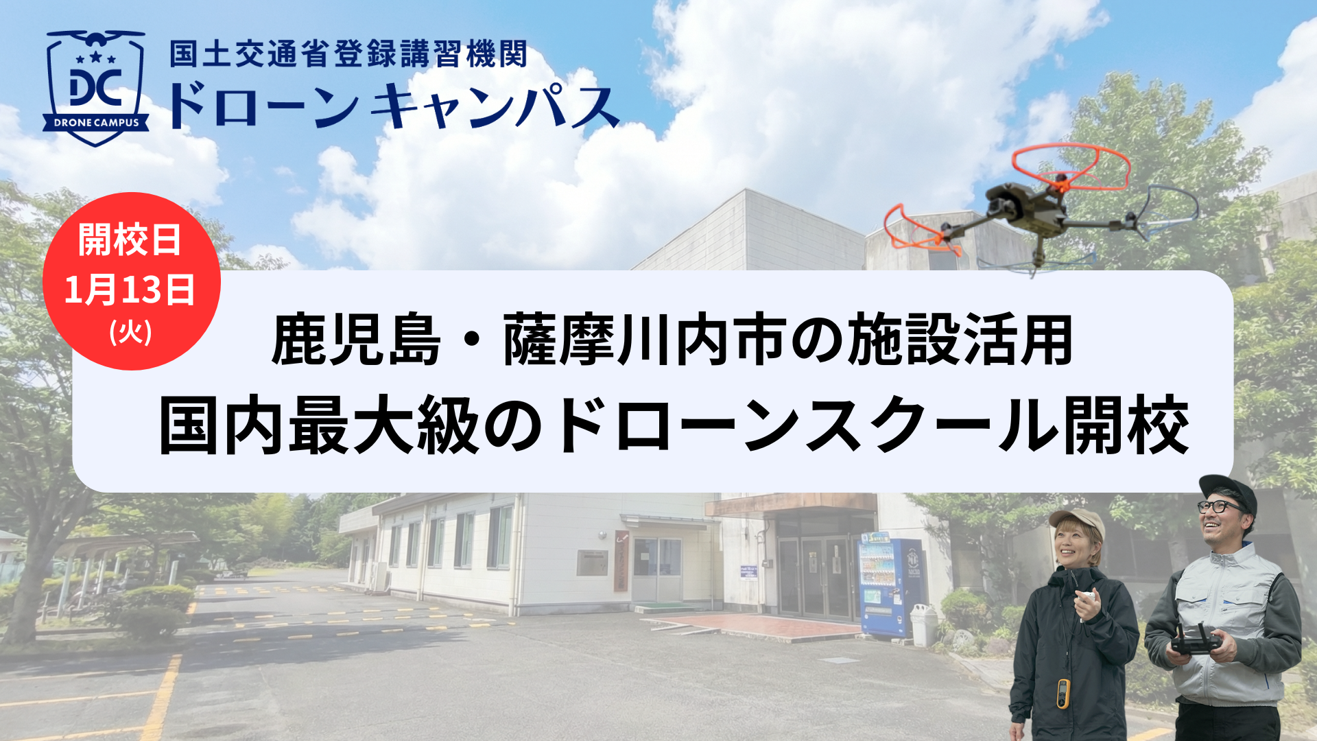 全国各地の廃校や屋内施設等を活用し、ドローン操縦の国家資格スクールにおける国内最大級グループを運営しているむげんのそら株式会社(本社:福井県鯖江市、代表取締役社長:久森 章裕)は、2026年1月13日(火)、鹿児島県薩摩川内市に国交省登録講習機関「ドローンキャンパス 鹿児島の空」を新規開校いたします。本校は鹿児島県内では初の開校で全国11拠点目となります。