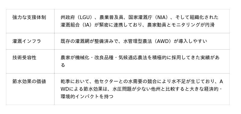 また、同州は西ビサヤ地域における主要な米生産地であり、水利用効率の改善や気候変動対応は、地域の食料安全保障にも直結します。これらの点から、ネグロス島はAWD導入によるメタン削減、用水効率改善、農家所得向上を同時に実現し得る、高いスケールメリットと展開性を備えた地域として評価されています。