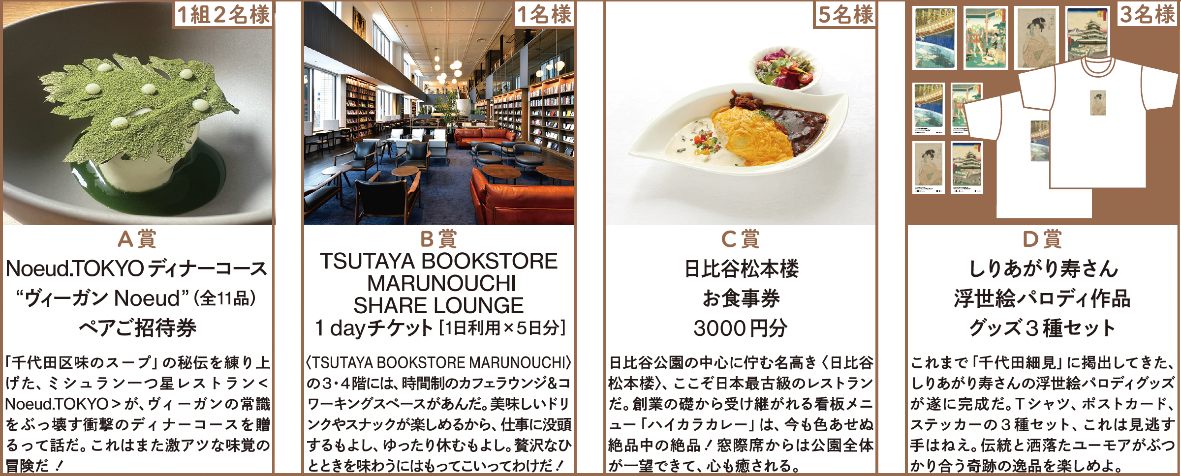 計4箇所の千代田区スポットを巡った方に豪華景品が当たるスポットラリー企画「千代田細見狩り」も誌面にて展開。誌面を入手して、奮ってご参加くださいませ。