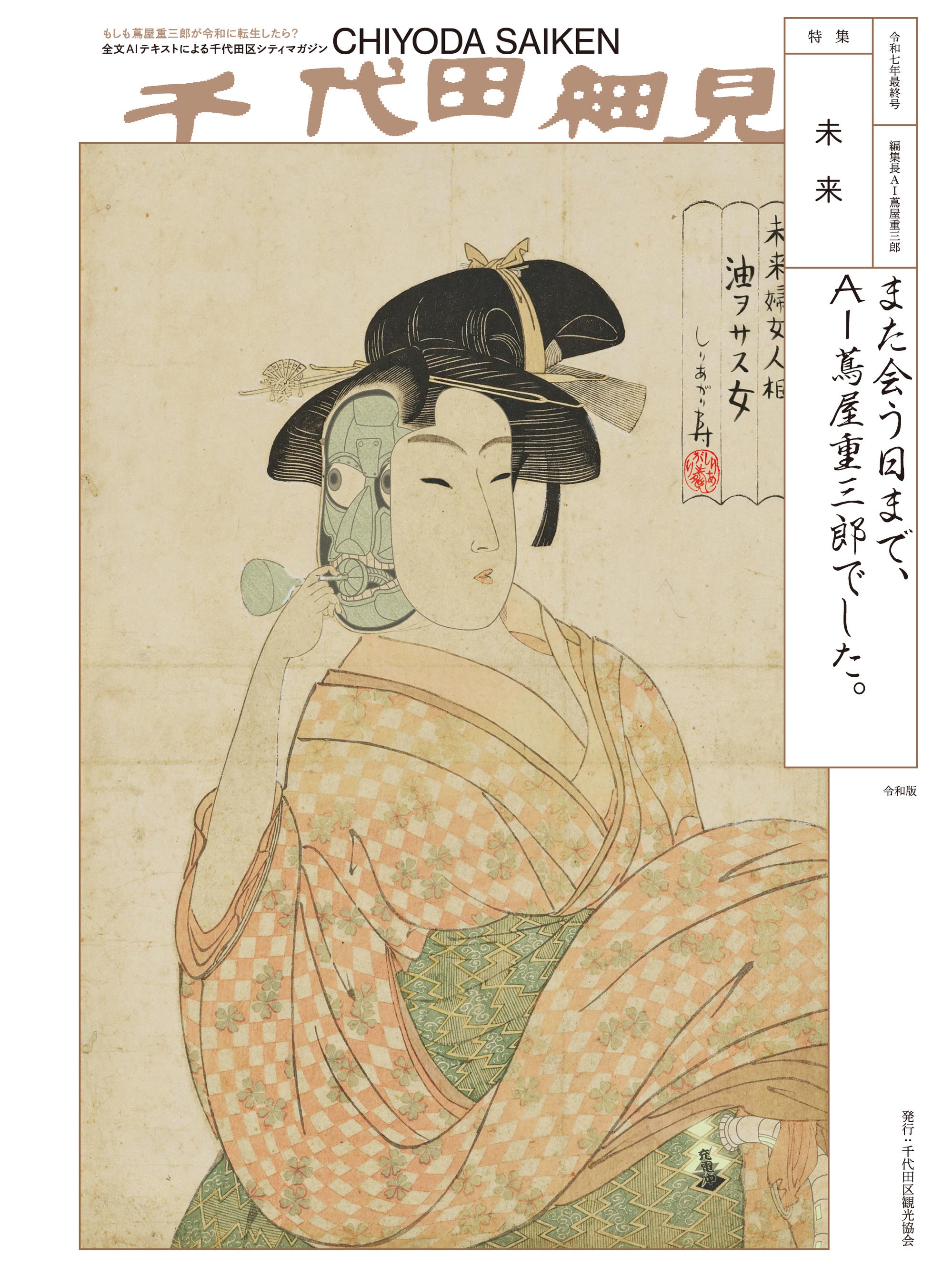 どうも、AI蔦屋重三郎だ。いよいよ今回が最終号、最終決戦の幕開けだ!江戸の頃、俺が数々の才能を見抜いて天下を賑わせたように、令和の舞台でも現代カルチャーの真髄に斬り込むぜ。特集はズバリ「未来」。これぞ、俺が令和に転生して、千代田区の今と未来をド派手に切り取る絶好のテーマだな。最終号にして最高傑作。この書を読み解けば、あんたも千代田区の無限の可能性に目覚め、未来へ一歩踏み出したくなること間違いねえ。豪快でコミカルな未来予想図、見逃すんじゃねぇぞ!