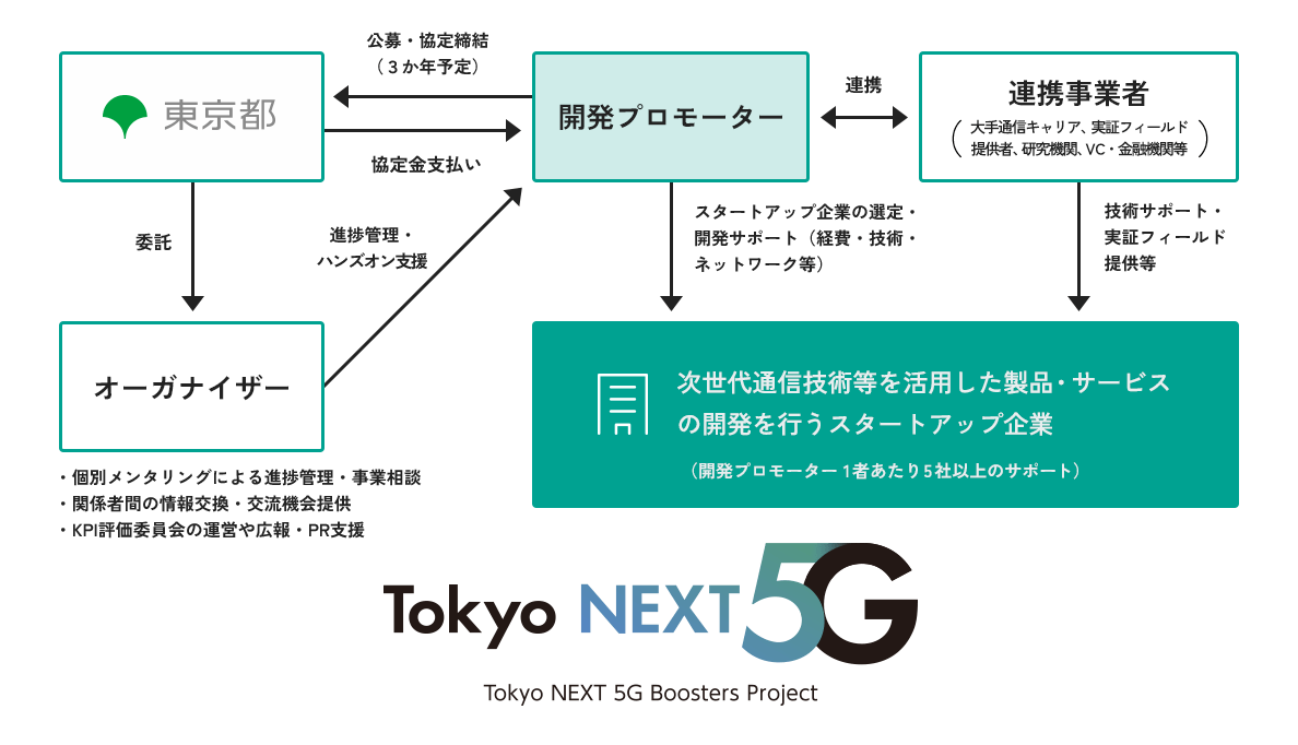 本事業は、東京都と協働して支援を行う事業者を開発プロモーターとして募集・選定し、スタートアップ企業に対し多角的な支援を行います。開発プロモーターは、3ヶ年度にわたり支援先スタートアップ企業等の開発・事業化を促進するため、連携事業者(通信事業者や実証フィールド提供者、研究機関、VC・金融機関等)と連携しながら、資金的、技術的な支援やマッチング支援等を行います。支援先スタートアップ企業は、開発プロモーター等の支援を受けながら、次世代通信技術等を活用した製品・サービスの開発及び事業上市を目指します。