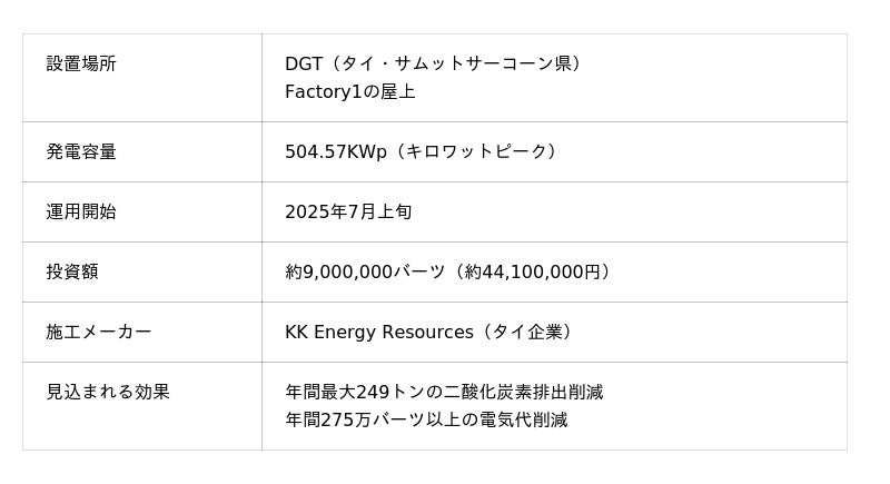 タイでは国のエネルギー計画に基づき再生可能エネルギーの比率拡大と温室効果ガス排出削減を目指しており、DGTはこれに対応し工場棟屋上に太陽光発電設備を設置、2025年7月から運用を開始しました。設備は500Kwpの発電が可能で、DGTの使用電力の約30%に相当します。これにより年間最大249トンの二酸化炭素排出削減をできる見込みです。