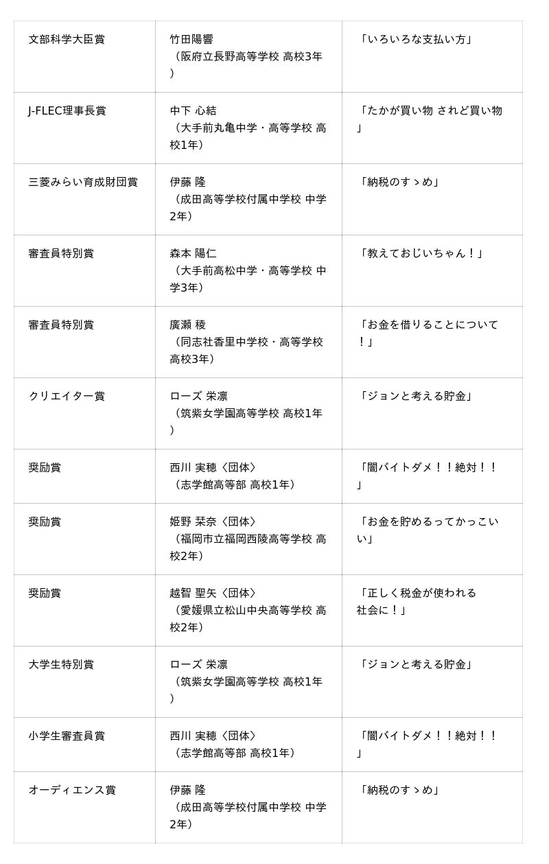 文部科学大臣賞やJ-FLEC理事長賞をはじめ、全国から寄せられた897作品の中から、個人・団体あわせて10作品が13の賞を受賞しました。