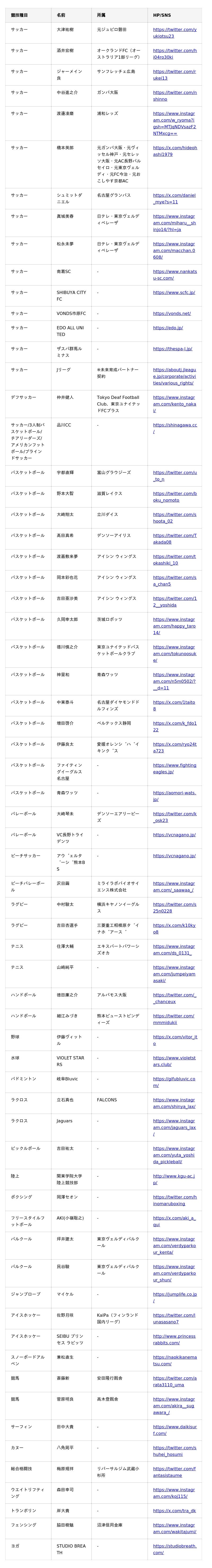 <BASE UP SPORTS サプライヤー契約一覧(現時点)>