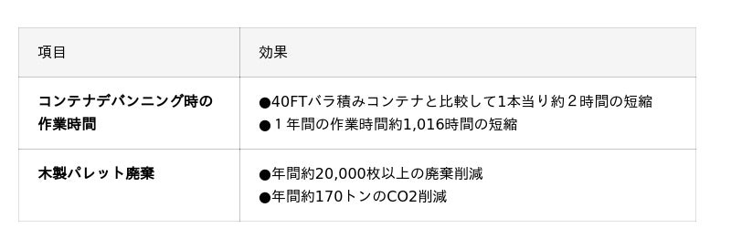 人手不足が深刻化している物流業界では、物流の結節点で生じる手荷役作業に起因する長時間労働や、過重な肉体的負担の解消が求められており、国も企業に対策を促しています。本件取り組みによる一貫パレチゼーションの導入は、海上コンテナへの積み込み時間を年間約1,016時間削減する効果が期待されるほか、従来発生していた木製パレットの廃棄にかかる環境負荷を軽減します。