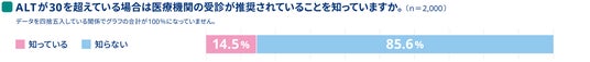 受診を検討するきっかけについて、約46.3%の人が「健康診断で肝機能の値が基準を超えたとき」と回答した一方で、肝機能検査値の認知度に課題があることから、肝機能検査値の正しい理解と認知拡大が受診行動につながることが示唆されました。
