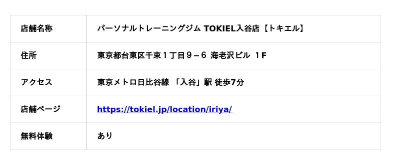 東京メトロ日比谷線 入谷駅『パーソナルトレーニングジム TOKIEL入谷店【トキエル】』オープン【東京都台東区千束1丁目9−6 海老沢ビル 1F】