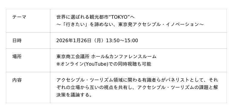 東京都では、国内外から多様な旅行者を迎えるにあたり、障害の有無や年齢、身体状況などに関わらずあらゆる方が安心して都内の観光を楽しめるアクセシブル・ツーリズムを推進しています。昨今の旺盛なインバウンド需要や世界的に加速する高齢化などを背景に、多様なニーズに応え誰もが快適に観光できる東京の実現に向けた気運をより一層高めるため、アクセシブル・ツーリズム推進シンポジウムが開催されます。