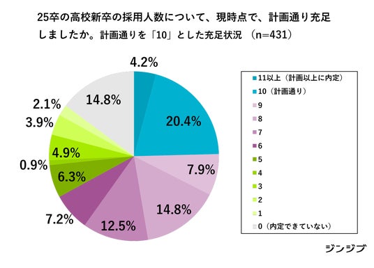 25卒の高卒採用の現在の採用結果については、「計画通りに充足した」(20.4%)、「計画以上に採用できた」(4.2%)と、全体の約4分の1近くが計画を達成または上回る結果となりました。