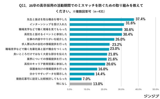 採用活動でのミスマッチを防ぐ取り組みとして最も多かったのは、「先生と接点を取る機会を増やした」(37.4%)で、高校との関係づくりを重視する姿勢がうかがえます。