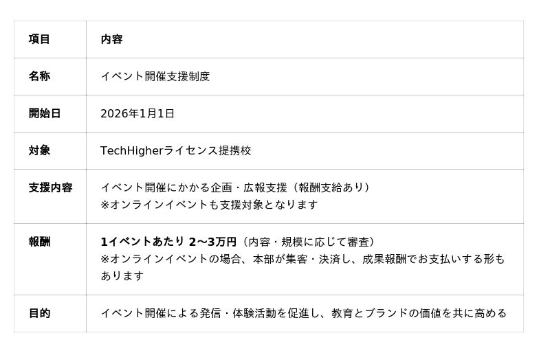TechHigherはこれまで、ライセンス提携校への販促物や教材提供を通じて、地域におけるデジタル教育の普及を支援してきました。しかし近年、地域の教育イベントの重要性が高まる中で、教室自らが企画・開催する活動を直接支援する仕組みが求められていました。そこで誕生したのが「イベント開催支援制度」です。この制度では、ライセンス提携校が主催するイベントに対して、TechHigherが広報・実行などをプレスリリースの配信や報酬支給などによりサポートします。