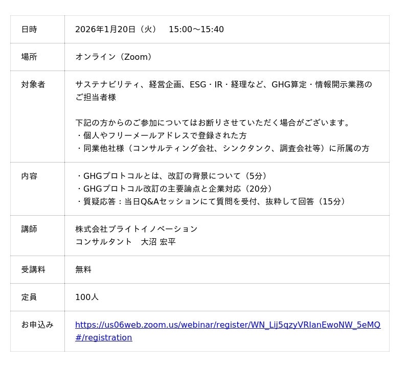 エンビプロ・ホールディングスエンビプログループの株式会社ブライトイノベーション(本社:東京都中央区、代表取締役社長:荻巣 和紀、以下「当社」)は、サステナビリティ、経営企画、ESG・IR・経理など、GHG算定・情報開示業務のご担当者様向けに、GHGプロトコル改訂を読み解くポイントについて無料ウェビナーを開催します。