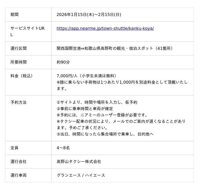 移動に関する課題解決に取り組むソーシャルデザインカンパニーである株式会社NearMe(本社:東京都中央区、代表取締役社長:高原幸一郎、以下「ニアミー」)は、高野山タクシー株式会社(本社:和歌山県伊都郡高野町、代表取締役社長:豊田英三)が運行主体となり実施する『関西国際空港・高野町交通アクセス向上事業』において、関西国際空港と和歌山県屈指の観光地である高野町を直接結ぶ「関西⇔高野直行便」の実証運行を開始します。また、本実証運行の開始に伴い、本日よりニアミーアプリからの予約受付を開始いたします。