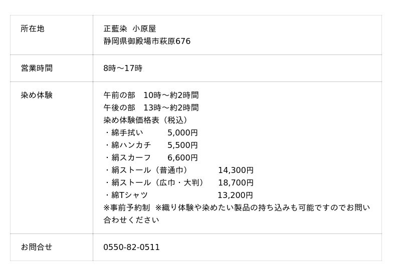 天然阿波藍を用い、土間に埋め込んだ甕(かめ)に木灰からつくった灰汁、石灰、ふすま、日本酒で仕込み発酵させた藍液に、糸や布を数回から時には数十回浸して染める江戸時代からの染め技法を受け継いだ正藍染 小原屋から作り出される静岡県指定の郷土工芸品。織物を手織機で織り上げ、長板中形染め、型染め、筒描き、絞り染めなど作品によって様々な技法が用いられます。江戸時代から使われてきた伝統の柄の型紙を彫り直しながら今日の作品に生かしています。御殿場市の工房では染め体験や織り体験ができ、併設のギャラリーで作品の購入もできます。実際に足をお運びいただき匠の技と藍の美しさを体感してみてはいかがでしょうか。