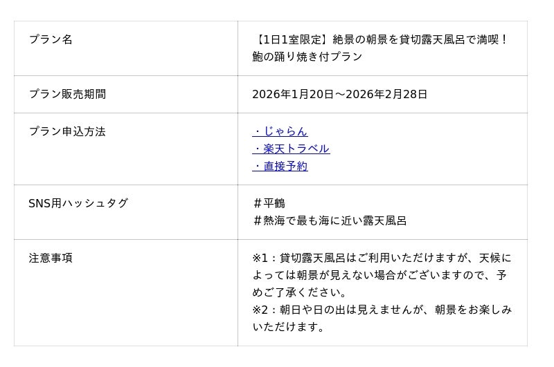 株式会社サイトプラス静岡県熱海市の老舗温泉宿「湯の宿 平鶴(ひらつる)」は2026年1月20日より、1日1室限定の特別宿泊プラン「絶景の朝景を貸切露天風呂で満喫プラン」を販売開始いたします。