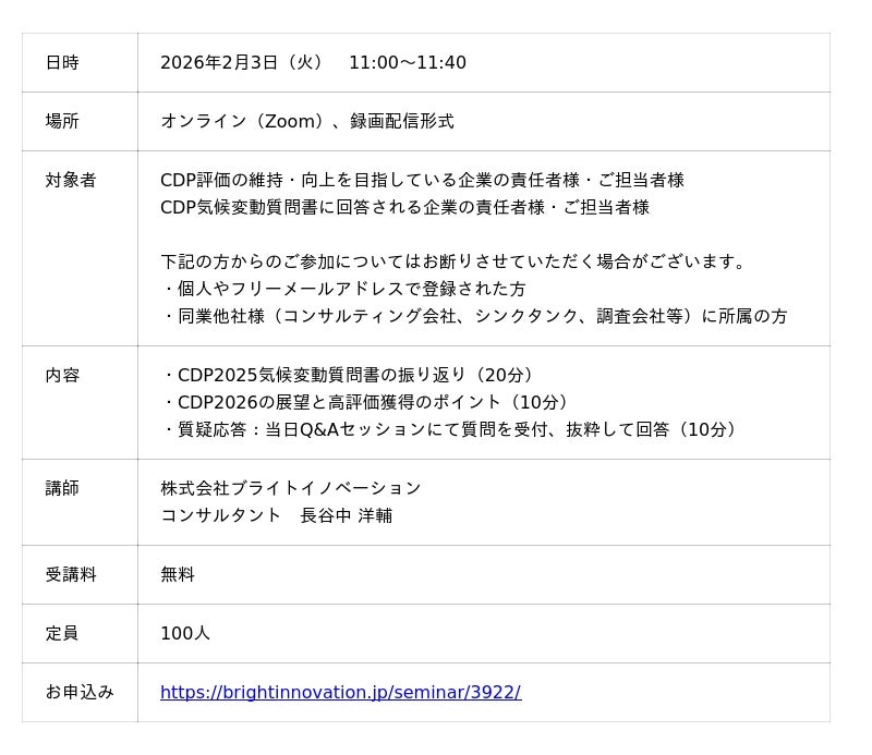エンビプログループの株式会社ブライトイノベーション(本社:東京都中央区、代表取締役社長:荻巣 和紀、以下「当社」)は、CDP評価の維持・向上を目指している企業の責任者様・ご担当者様、またはCDP気候変動質問書に回答される企業の責任者様・ご担当者様向けに、気候変動質問におけるCDP2025総括とCDP2026質問書の展望について無料ウェビナーを開催します。