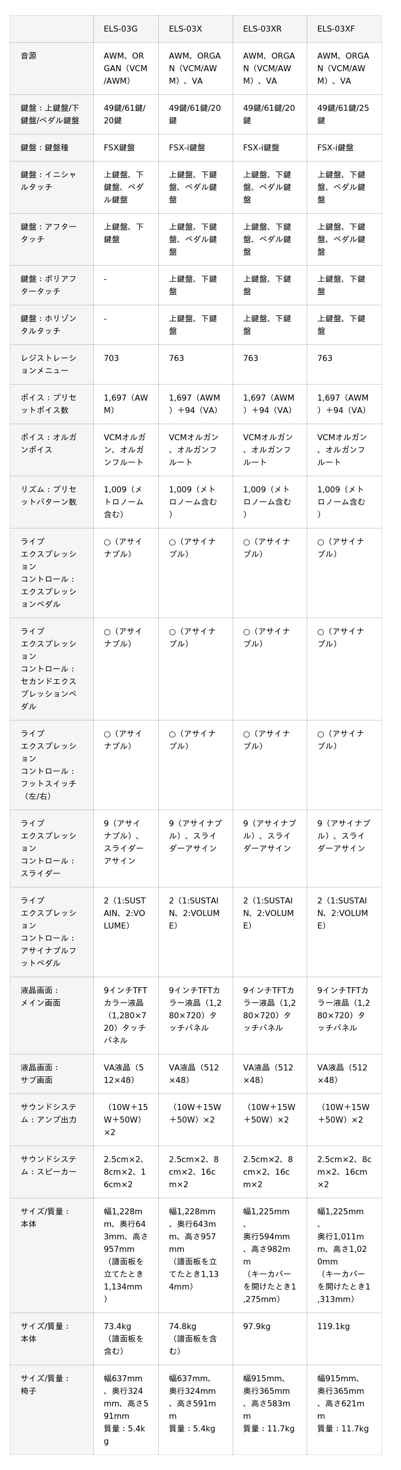 ELS-03シリーズは、目的や演奏スタイルに応じて選択可能な「クラスX」と「クラスG」で構成されています。「クラスX」は、主要機能に加えてFSX-i鍵盤を搭載しており、より細やかで豊かな表現ができるフラッグシップモデルです。本体とスタンドを取り外し運搬が可能な「ELS-03X」、本体とスタンドが一体型で安定した演奏が可能な「ELS-03XR」、フルスケールのペダル鍵盤を搭載しより表現力の追求が可能な「ELS-03XF」の3モデルから選択できます。一方「クラスG」は、基本的な演奏機能を備えたスタンダードモデルで、本体とスタンドを取り外し運搬が可能な「ELS-03G」を用意しています。さらに、「グレードアップユニット」を使用することで、「クラスG」から「クラスX」へのアップグレードが可能となり、より高い表現力を追求しながら、長くご愛用いただけます。