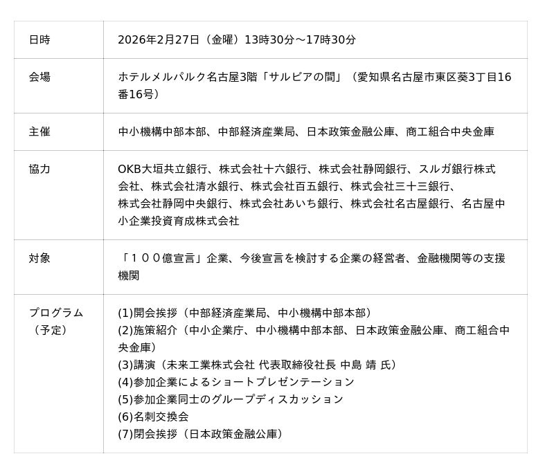 中小機構(独立行政法人中小企業基盤整備機構)中部本部、中部経済産業局、株式会社日本政策金融公庫、株式会社商工組合中央金庫は、東海地域で初めて「100億企業創出経営者ネットワーク」を開催します。本ネットワークでは、100億宣言を行った経営者や、今後宣言を検討している経営者が集い、高い成長意欲を持つ経営者同士のディスカッションや交流を通じて、業種・社歴を超えた成長の視座や発想、経営課題の気づきを得る場を提供します。東海4県(岐阜県、静岡県、愛知県、三重県)の全ての地方銀行が協力機関として参画し、東海地域の支援機関が一体となって、売上高100億円を目指す企業の挑戦を支援します。