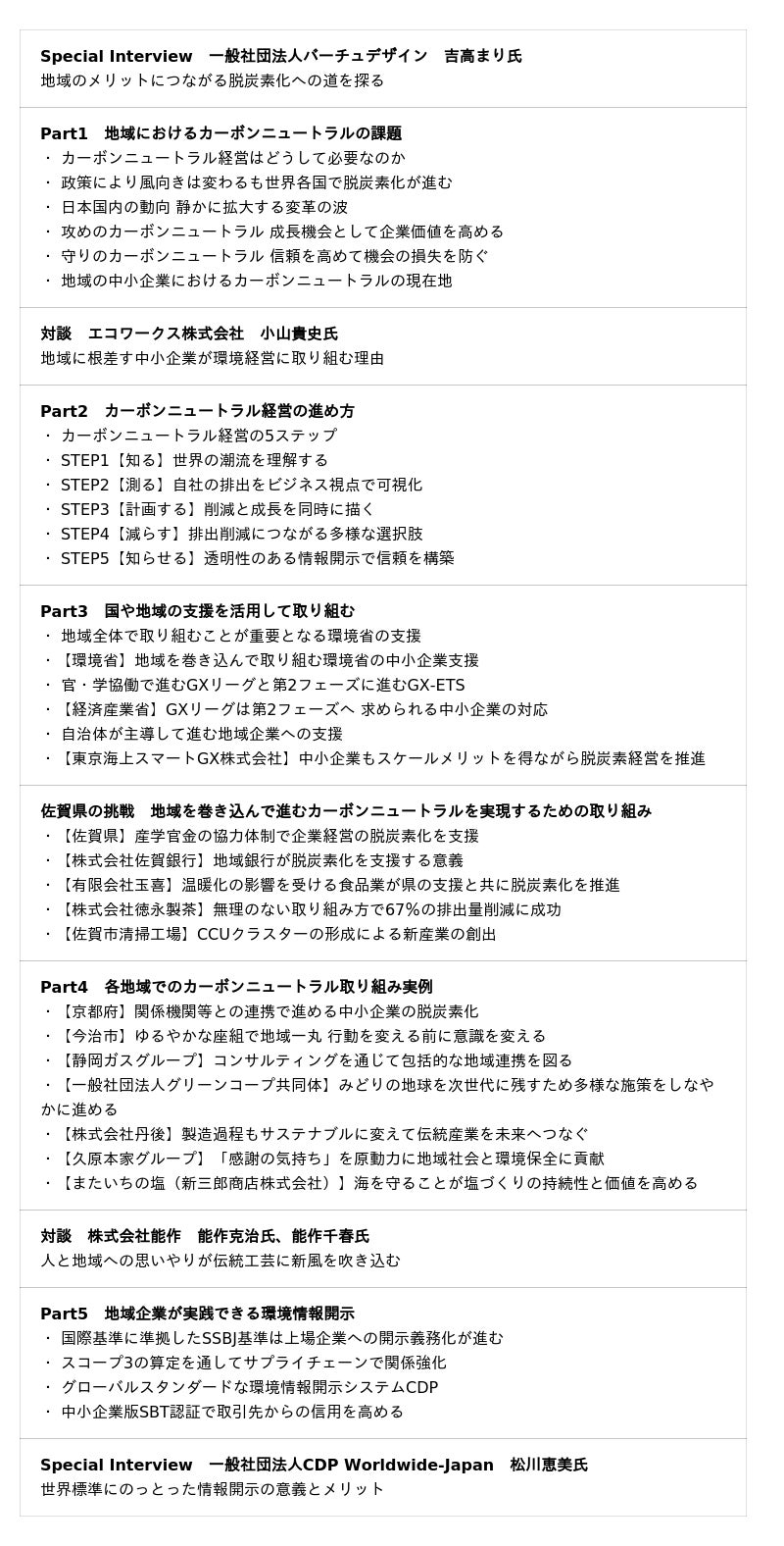 地域の脱炭素化を支援する立場にある大企業や金融機関、自治体にとっても参考となる内容であり、中小企業や地域を支える多様なステークホルダーが、カーボンニュートラルを成長機会と捉えて取り組みを検討・推進する際の手がかりとなる一冊です。