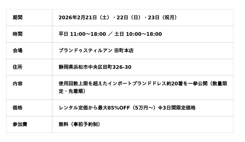 静岡県浜松市でブライダル事業を展開する株式会社スティルアン(本社:静岡県浜松市中央区田町326-30、代表取締役社長:石川 学)は、2026年2月21日(土)~23日(祝月)の3日間、使用回数を終えた上質なインポートドレスを「お譲りドレス」として販売する期間限定イベント「お譲りドレス会」を開催いたします。