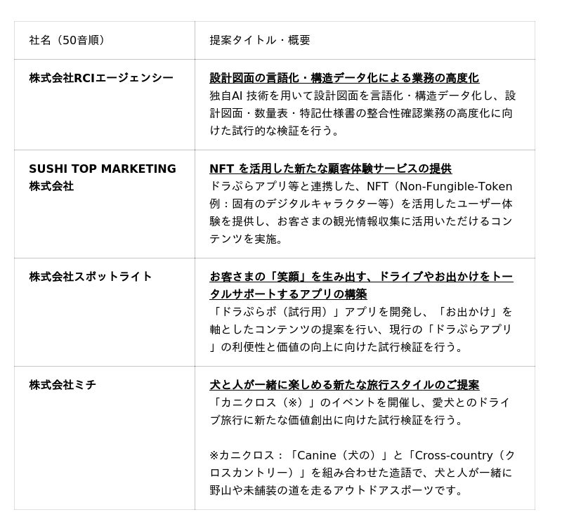 【 NEXCO東日本 × AUBA 】共創パートナー採択企業4社が決定!『E-NEXCO OPEN INNOVATION PROGRAM 2025(ドラぷらイノベーションラボ 第V期)』