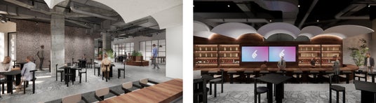 施設の一部には、社員同士のコミュニケーションに加え、社外との緩やかな交流が生まれる場を設けます。1階には、飲食用途で活用されてきたバーカウンターを再利用し、日中はカフェ、夕方以降はバーとしても活用できる空間を整備します。打合せ・休憩・イベント時の交流拠点として、仕事と日常、社内と社外が自然につながる場を目指します。ここから、地域の課題やニーズを捉え、外部企業・大学・スタートアップ等とも連携した共創を育てていきます。