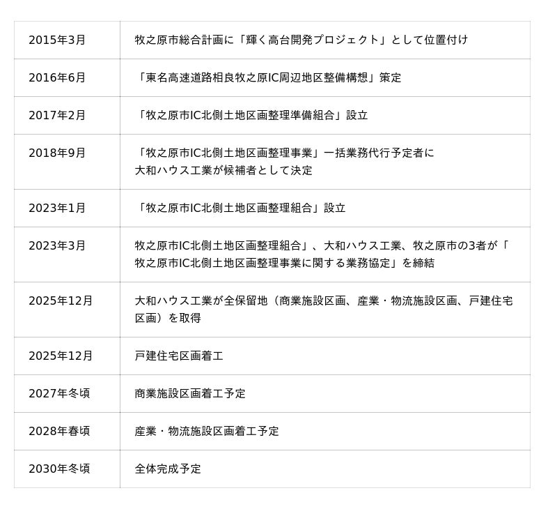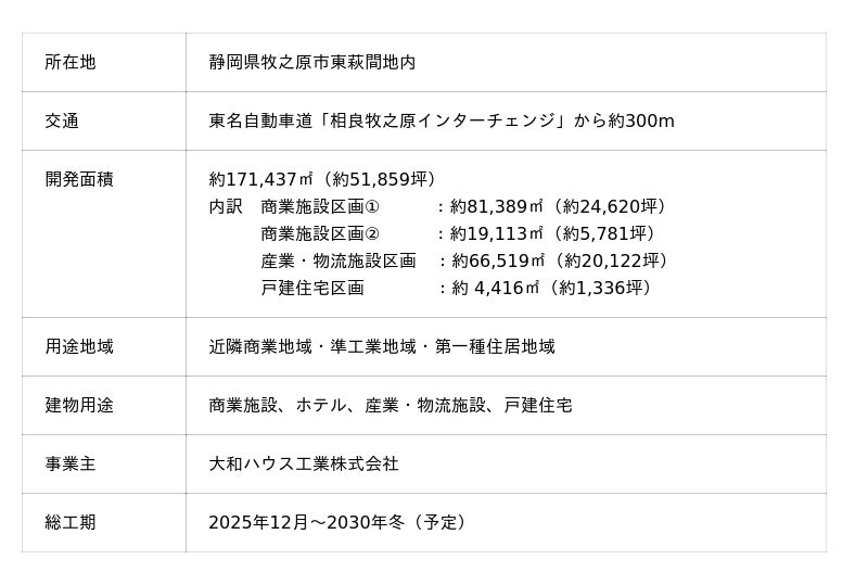なお、本プロジェクトは、大和ハウス工業が2025年12月までに取得した「牧之原市IC北側土地区画整理事業」の保留地等(約17.14万平方メートル )を、商業施設区画(2区画)、産業・物流施設区画、戸建住宅区画として全4区画開発する予定で、2030年冬頃に全体の完成を予定しています。